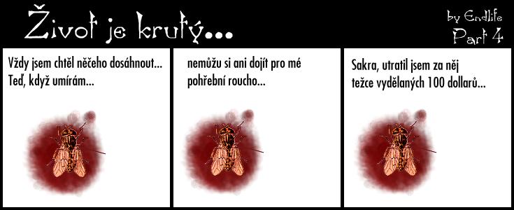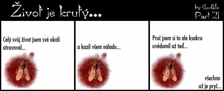 Krátký komiksovitý proužek „Život je krutý“ vznikal v září až říjnu 2002 pak ještě pár kousků počátkem dubna 2003. Je to docela zajímavě depresivní věc, tak ji tady nechávám. Takto zněl popisek v době, kdy ještě hovado vznikalo: